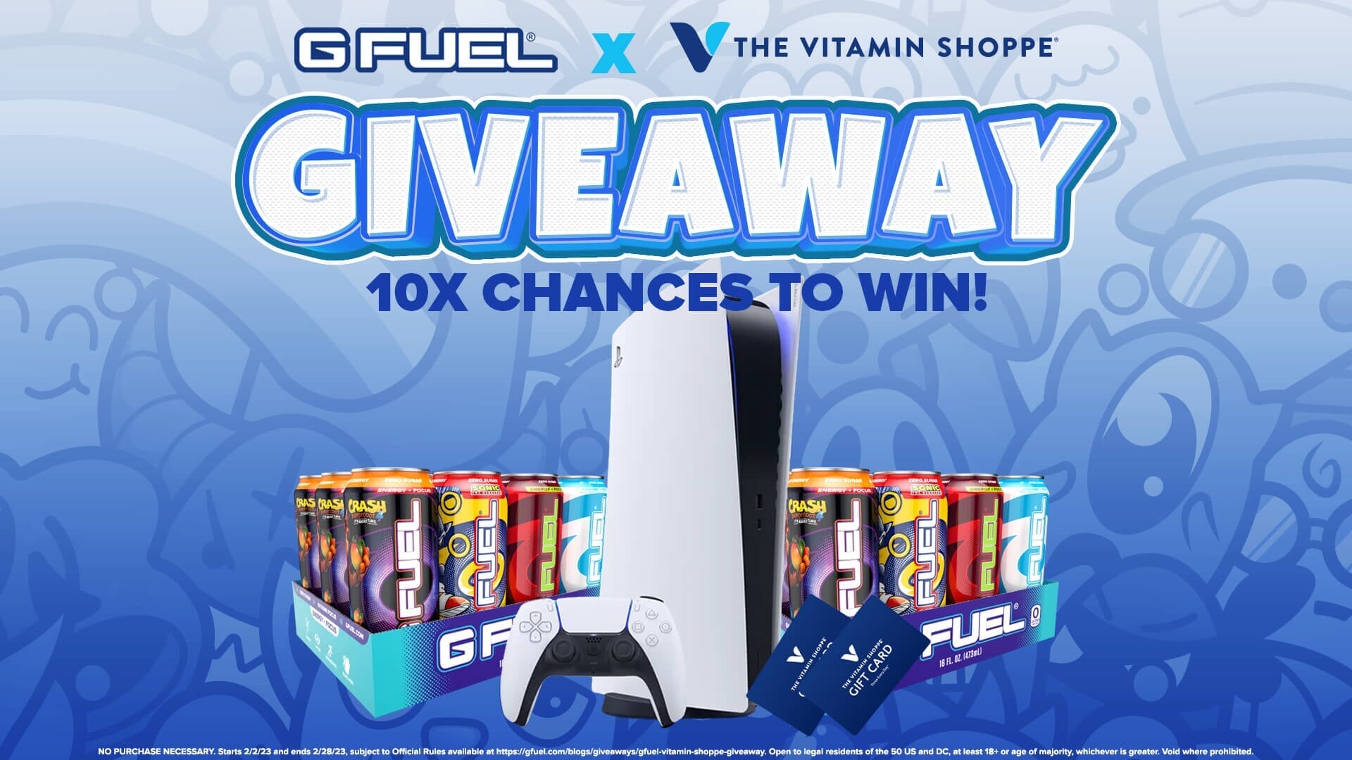 Grand Prizes: Three (3) grand prizes will be awarded. The ARV of each grand prize is $556.98. The total ARV of all grand prizes available to be won is $1,670.94. Each Grand Prize Winner will receive one (1) Sony PS5 (ARV $499.99), one (1) GFUEL variety 12-pack of cans (ARV $31.99) and one (1) $25 Vitamin Shoppe Gift Card (ARV $25).