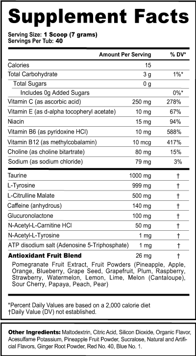 Each 15-calorie serving of Energy Formula powder contains 140 mg of caffeine and is focus amino-fortified, packed with antioxidants and vitamin-fortified with Vitamins C + E + B12 + B6. Each 0-calorie G FUEL Can contains 300 mg of caffeine, zero sugar and zero calories, along with proprietary energy and focus-enhancing complexes. DON'T WANT CAFFEINE? G FUEL Hydration Formula is calorie free, sugar free and caffeine free. The G FUEL Hydration line features a combination of the following key ingredients: the focus-enhancing amino acid L-Tyrosine; vitamins C, E, B12 and B6; and electrolytes to promote hydration.