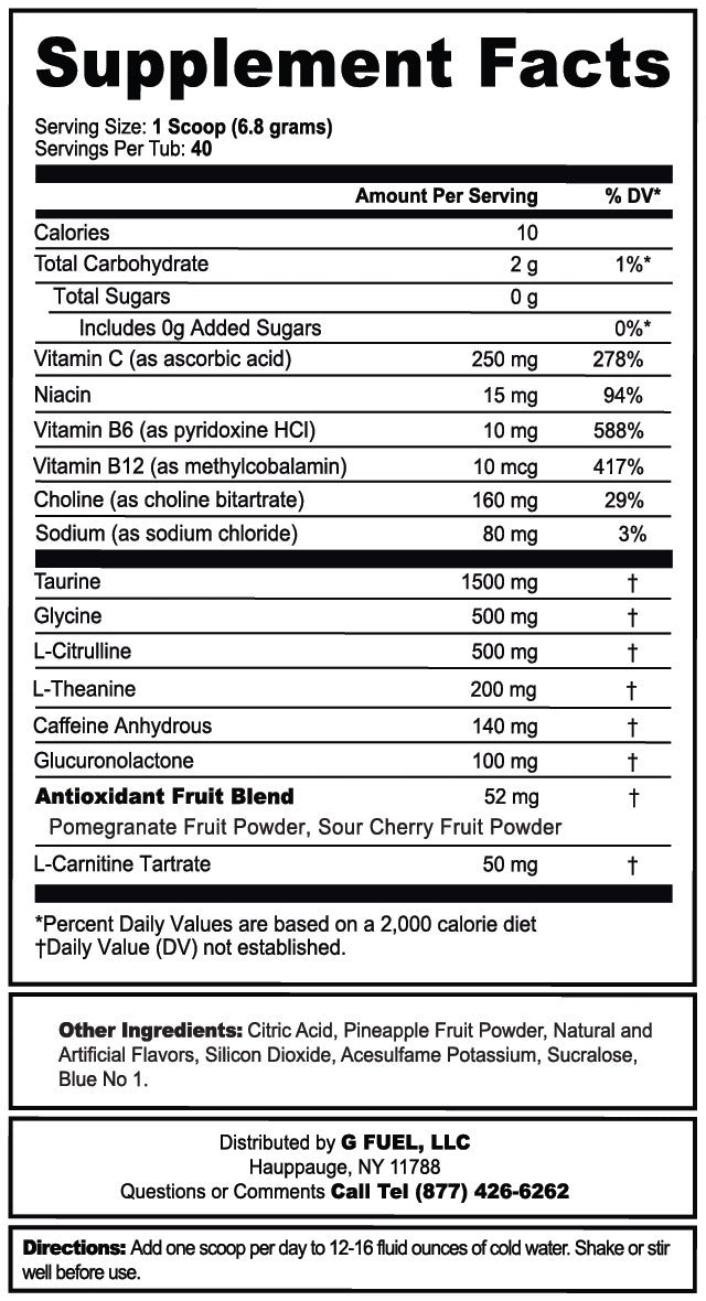 Each 15-calorie serving of Energy Formula powder contains 140 mg of caffeine and is focus amino-fortified, packed with antioxidants and vitamin-fortified with Vitamins C + E + B12 + B6. Each 0-calorie G FUEL Can contains 300 mg of caffeine, zero sugar and zero calories, along with proprietary energy and focus-enhancing complexes. DON'T WANT CAFFEINE? G FUEL Hydration Formula is calorie free, sugar free and caffeine free. The G FUEL Hydration line features a combination of the following key ingredients: the focus-enhancing amino acid L-Tyrosine; vitamins C, E, B12 and B6; and electrolytes to promote hydration.