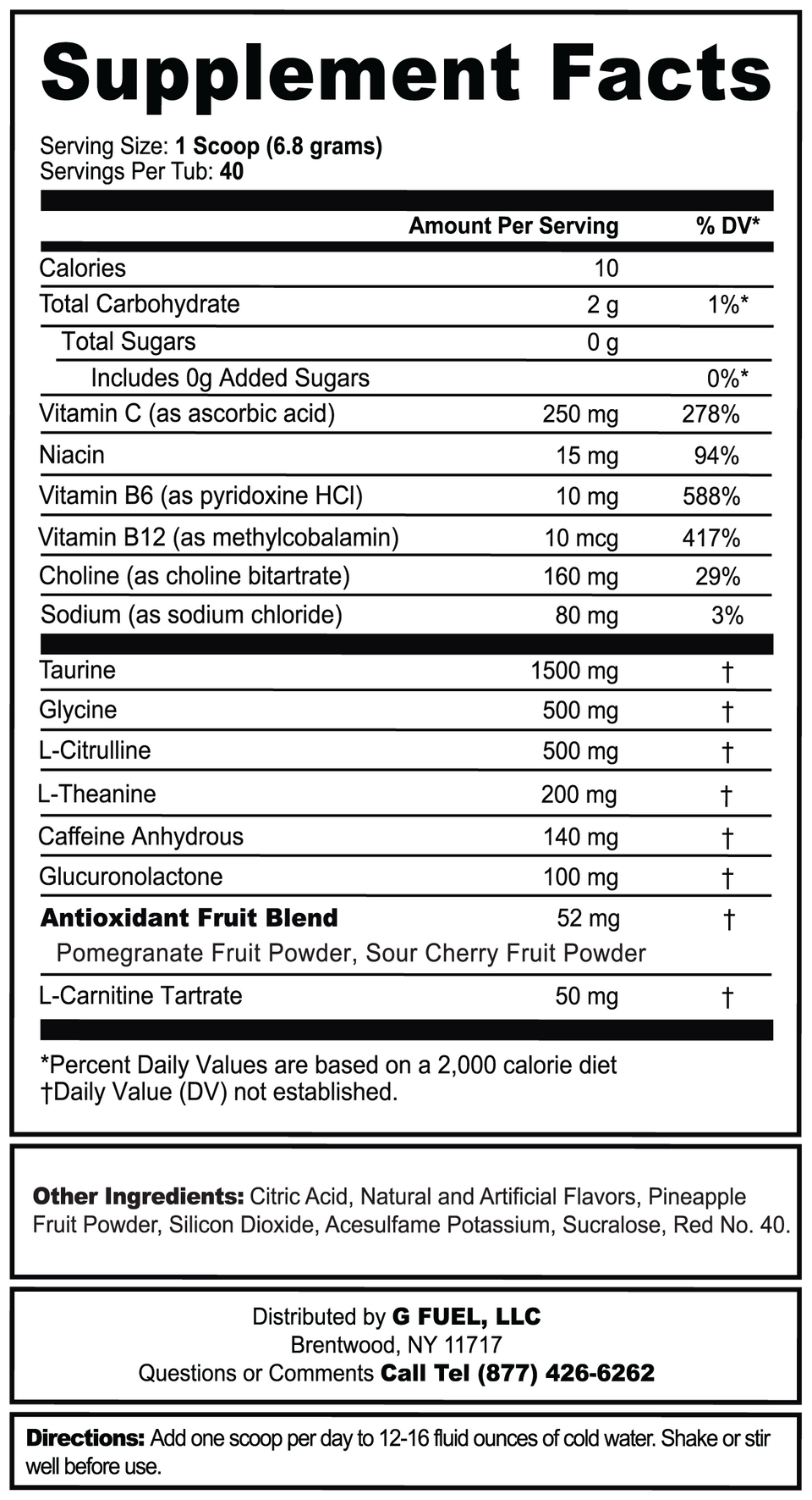 Each 15-calorie serving of Energy Formula powder contains 140 mg of caffeine and is focus amino-fortified, packed with antioxidants and vitamin-fortified with Vitamins C + E + B12 + B6. Each 0-calorie G FUEL Can contains 300 mg of caffeine, zero sugar and zero calories, along with proprietary energy and focus-enhancing complexes. DON'T WANT CAFFEINE? G FUEL Hydration Formula is calorie free, sugar free and caffeine free. The G FUEL Hydration line features a combination of the following key ingredients: the focus-enhancing amino acid L-Tyrosine; vitamins C, E, B12 and B6; and electrolytes to promote hydration.
