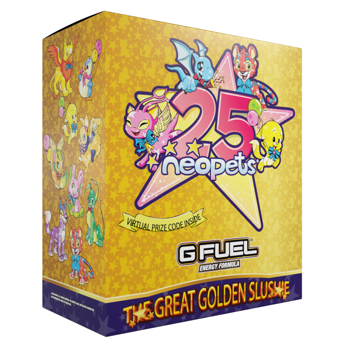 ©Celebrate 25 Years of Neopian Adventures with The Neopets 25th Anniversary Collector's Box. This enchanting collector's set is more than just a box - it's a ticket down memory lane, wrapped in vibrant nostalgia and bursting with Kiwi Orange flavor. Whether you're training for the Altador Cup, taking on Punchbag Bob in the Battledome, or just hanging out in Faerieland, this collector's box is your ultimate companion. Included in the set is the 40 Serving GOLDEN BERRY Energy Tub, The GREAT GOLDEN SLUSHIE Tumbler and a Virtual Prize Code to use at Neopets.com.