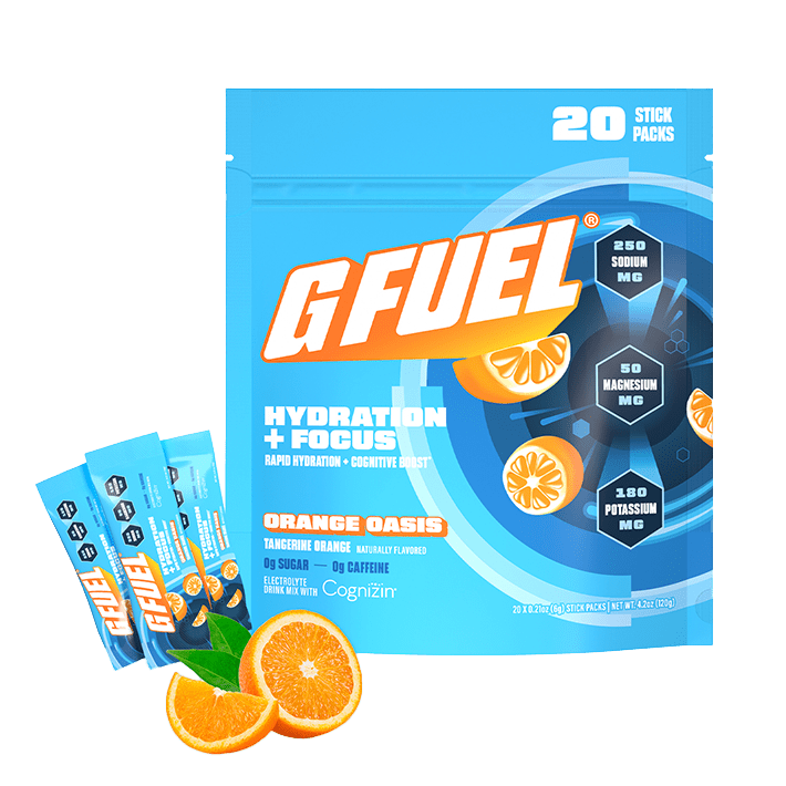 Need to hydrate fast? Meet G FUEL Hydration + Focus, our essential hydration powder that mixes revitalizing electrolytes and brain-boosting Cognizin® to get you refreshed, refocused and back in the game. Enjoy 20 individual stick packs of Orange Oasis, balanced to meet everyday hydration needs and packed with sugar free tangy citrus flavor. Formulated for players, you've never tasted a drink mix quite like this one!