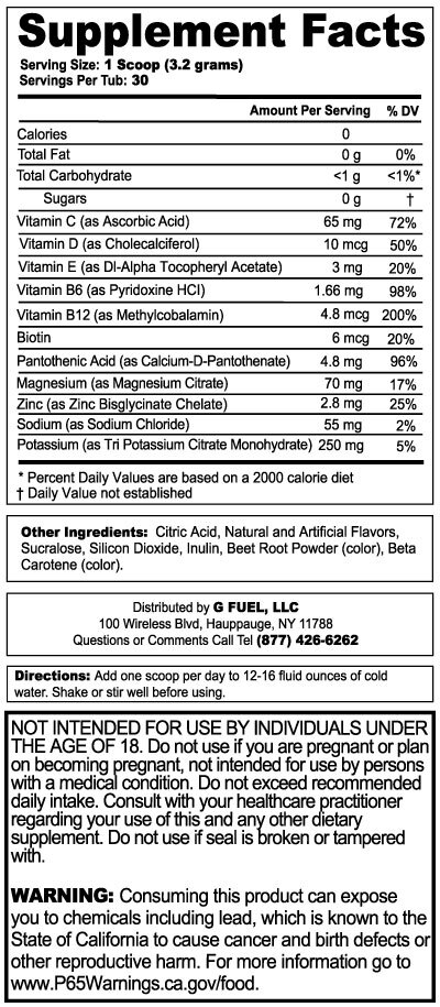 Each 15-calorie serving of Energy Formula powder contains 140 mg of caffeine and is focus amino-fortified, packed with antioxidants and vitamin-fortified with Vitamins C + E + B12 + B6. Each 0-calorie G FUEL Can contains 300 mg of caffeine, zero sugar and zero calories, along with proprietary energy and focus-enhancing complexes. DON'T WANT CAFFEINE? G FUEL Hydration Formula is calorie free, sugar free and caffeine free. The G FUEL Hydration line features a combination of the following key ingredients: the focus-enhancing amino acid L-Tyrosine; vitamins C, E, B12 and B6; and electrolytes to promote hydration.