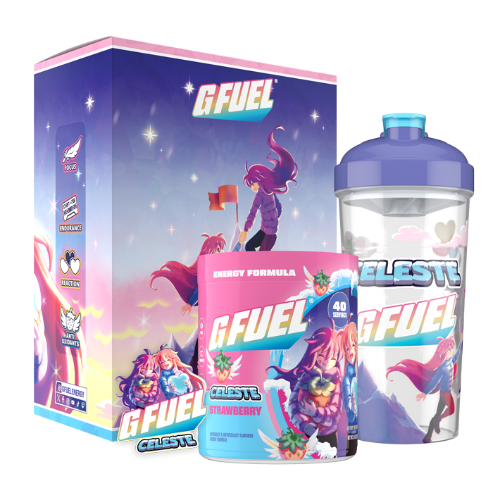 Our limited-edition Celeste Strawberry Collector’s Box includes an exclusive 24 oz Celeste Shaker Cup and a sticker featuring custom artwork inspired by the game, designed by artist Fuwamo—plus, of course, a 40-serving energy tub of Celeste Strawberry. It’s the perfect collectible for Celeste fans or anyone in need of a sweet pick-me-up!
