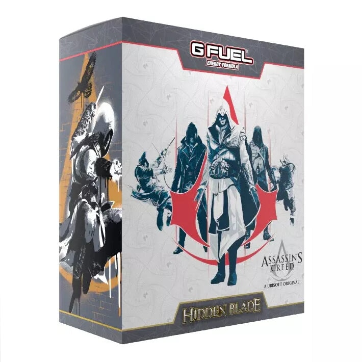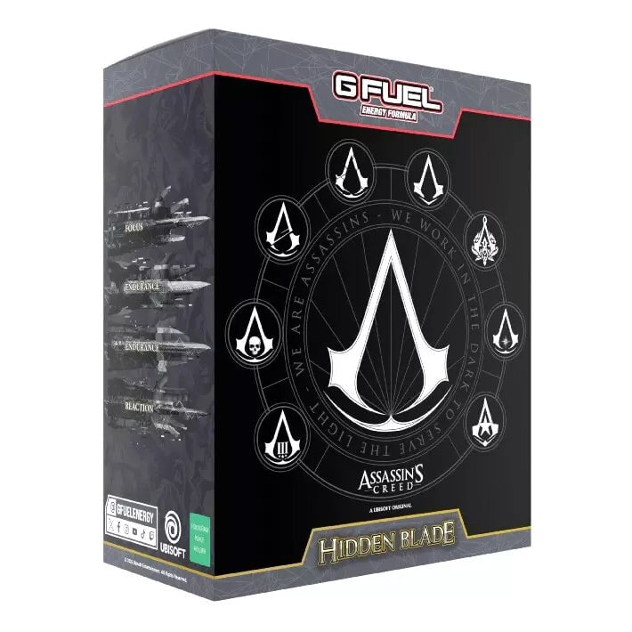 Enter the world of Assassin's Creed with G FUEL Hidden Blade Energy Formula! Perfect for exploring any point in history, this sangria-flavored tonic will help energize the senses and keep you focused on your next target. The limited-edition G FUEL Hidden Blade Collector's Box contains the 40-serving energy formula tub, plus a special 24 oz Assassin's Creed Shaker Cup and decorative sticker that pays homage to the iconic video game franchise. So sharpen your blades, step into the shadows, and prepare to strike with G FUEL!